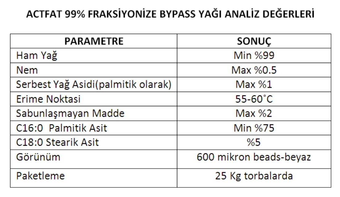 Actfat 99%, ruminantlar ve monogastrik hayvanlar için enerji kaynağı olup, taze palm yağı fraksiyonlarından elde edilen fraksiyonize bypass yağıdır. ▶ Süt ve süt yağı oranını artırır,
